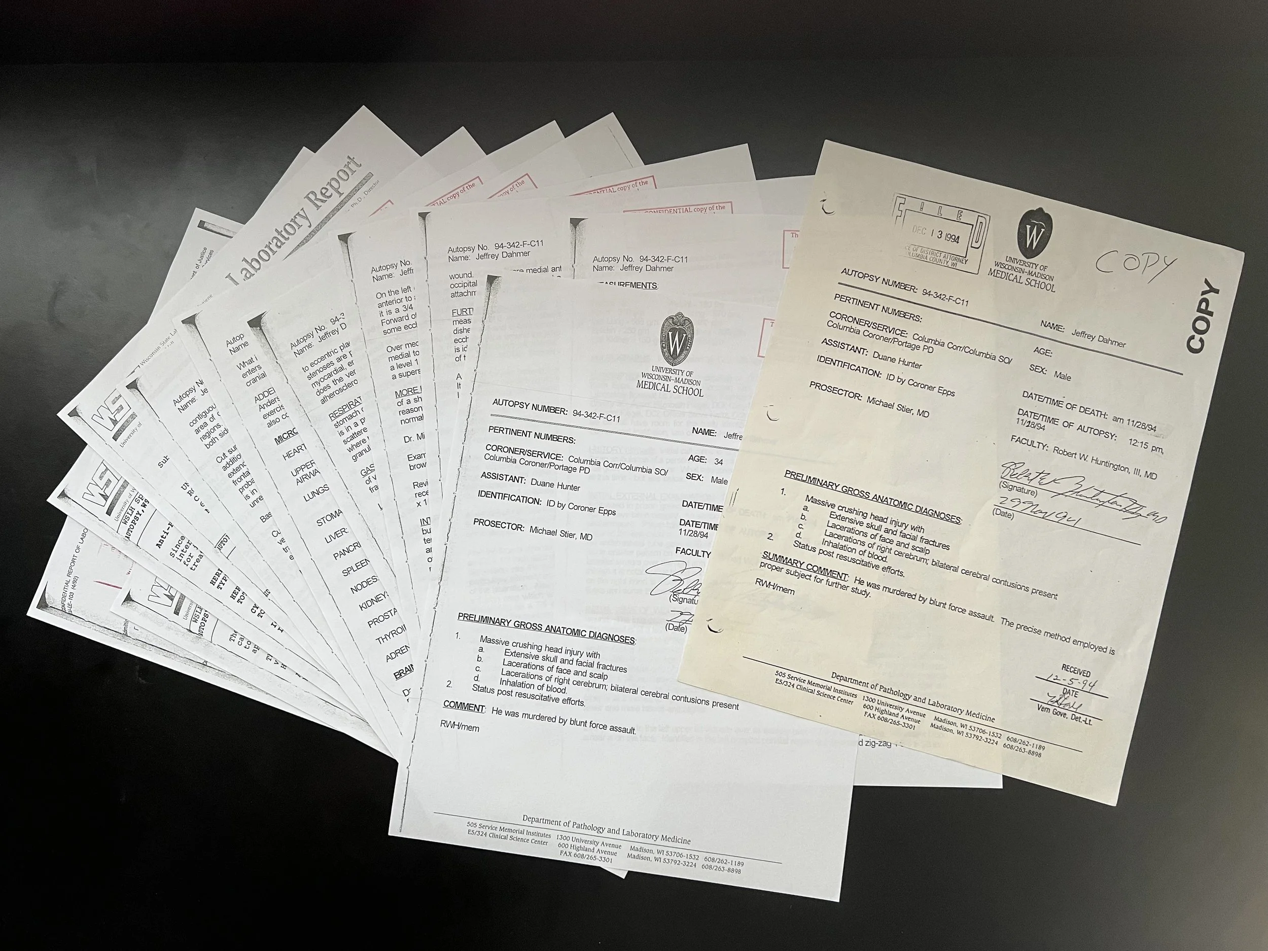Complete set- Preliminary Jeffrey Dahmer Autopsy Report / Lionel Dahmer’s Copy; and Final Report with all details and lab results.