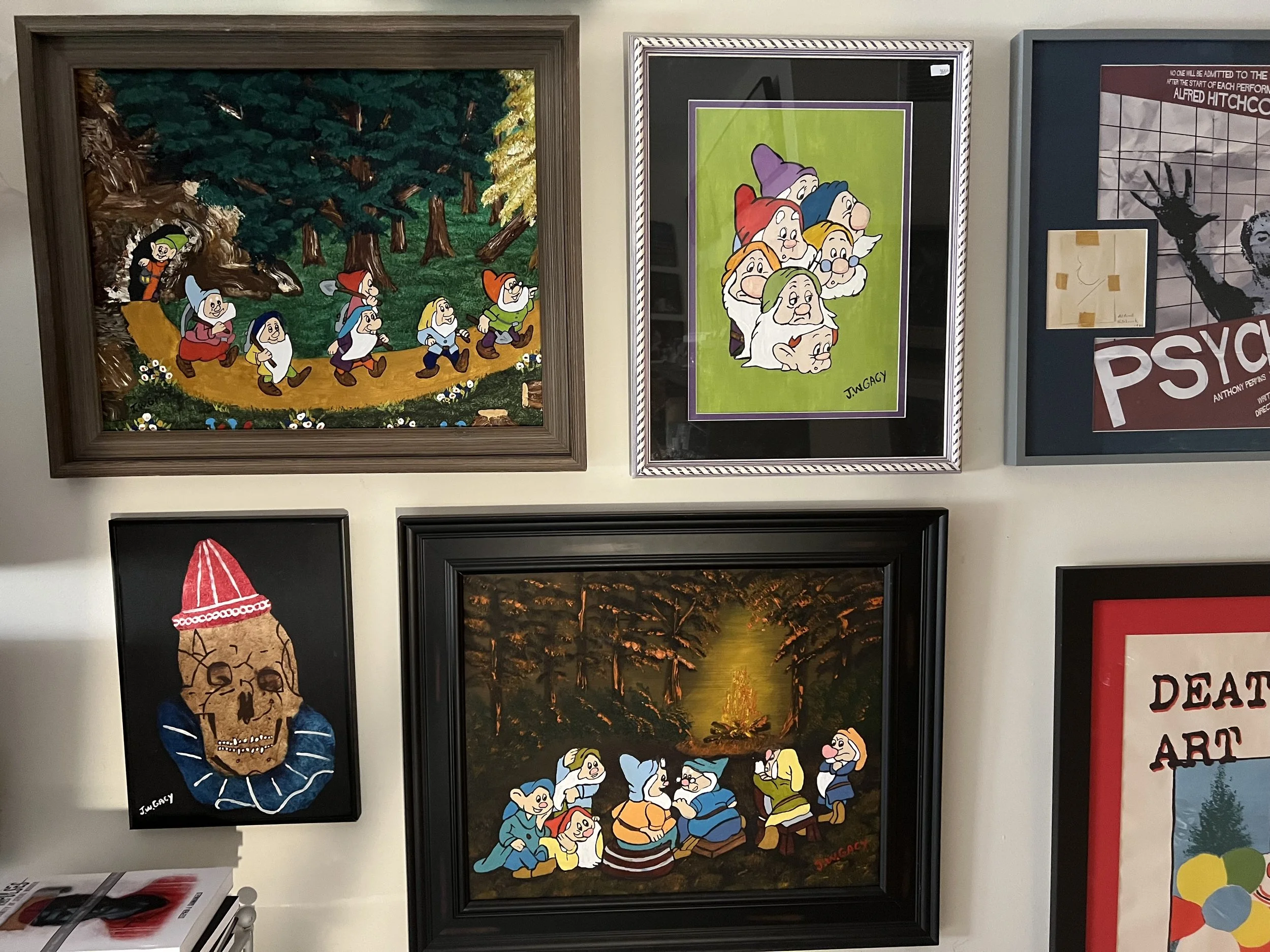 Paintings by John Wayne Gacy: Skull Clown, 7 Little Friends and 2 from the Hi Ho series.